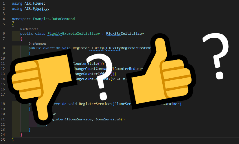 There’s a lot of little bits to write to add a new thing from scratch. A new Feature, with new Actions and Reducers, and the binding that into your FluxityInitialiser. We’ve seen snippets of these earlier. None of that is overly complicated but it is a bunch of lines of code to create that can feel like a big hurdle to get started. I’ve not found that too onerous or tedious yet but we can definitely make this nicer with either code snippets in the IDE or code gen to auto create some of this binding. Right now you at least need to change binding and a new file with the State, the Actions, the Reducers in it. If you need Effects, that’s another file, probably per responsibility or domain. Then you need to dispatch from somewhere, that’s in some other file. To see all the parts that cause change or take part in a dispatch flow, you might want to see 5 files at once. That probably doesn’t fit on a monitor and if you aren’t used to working across a lot of different files, just plain disorienting. Due to so many small bits and files, we also end up with lots of small functions and classes, and end up approaching Java levels of long and specific class names. Some favourite examples include, UserAttemptTriggerPullOutOfAmmoCommand, DecreaseControllerRumbleIntensityCommand, and HitReceiverReloadSceneDispatcher.